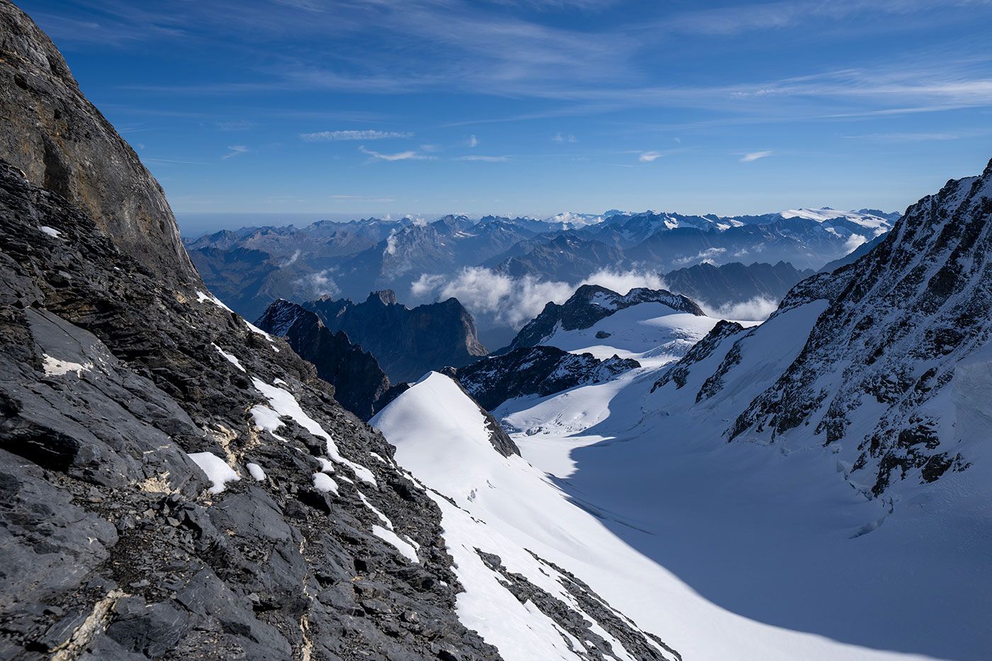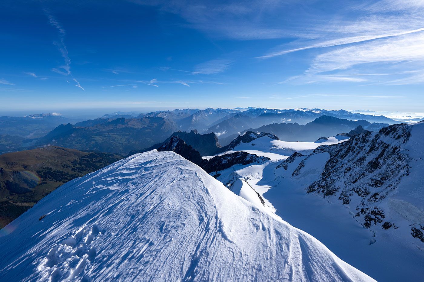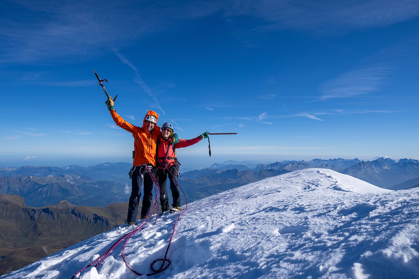 Von der Hütte lässt sich der Gipfelhang nicht einsehen und auch nicht der Schneegipfel des Wetterhorns. Jetzt endlich wissen wir, wovon uns die Bergsteiger jeweils mit leuchtenden Augen berichten. Nach etwas mehr als vier Stunden stehen wir also überglücklich zum ersten Mal auf Grindelwald's Hausberg. 3692 Meter über Meer, umgeben von den mächtigsten Gipfeln der Berneralpen und ein grandioser Weitblick bis zum Säntis und zum Chasseral.