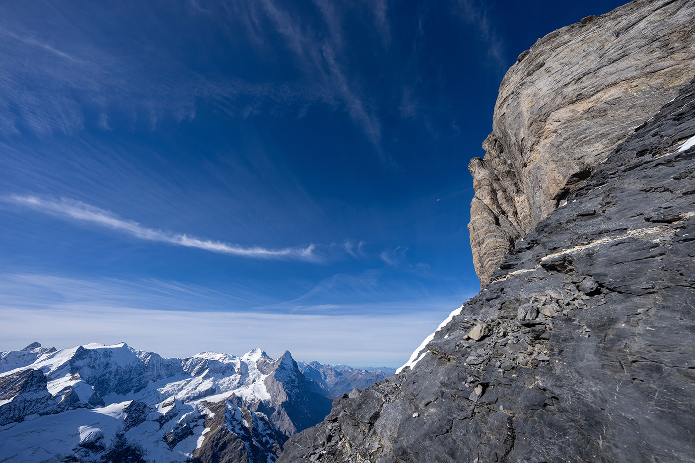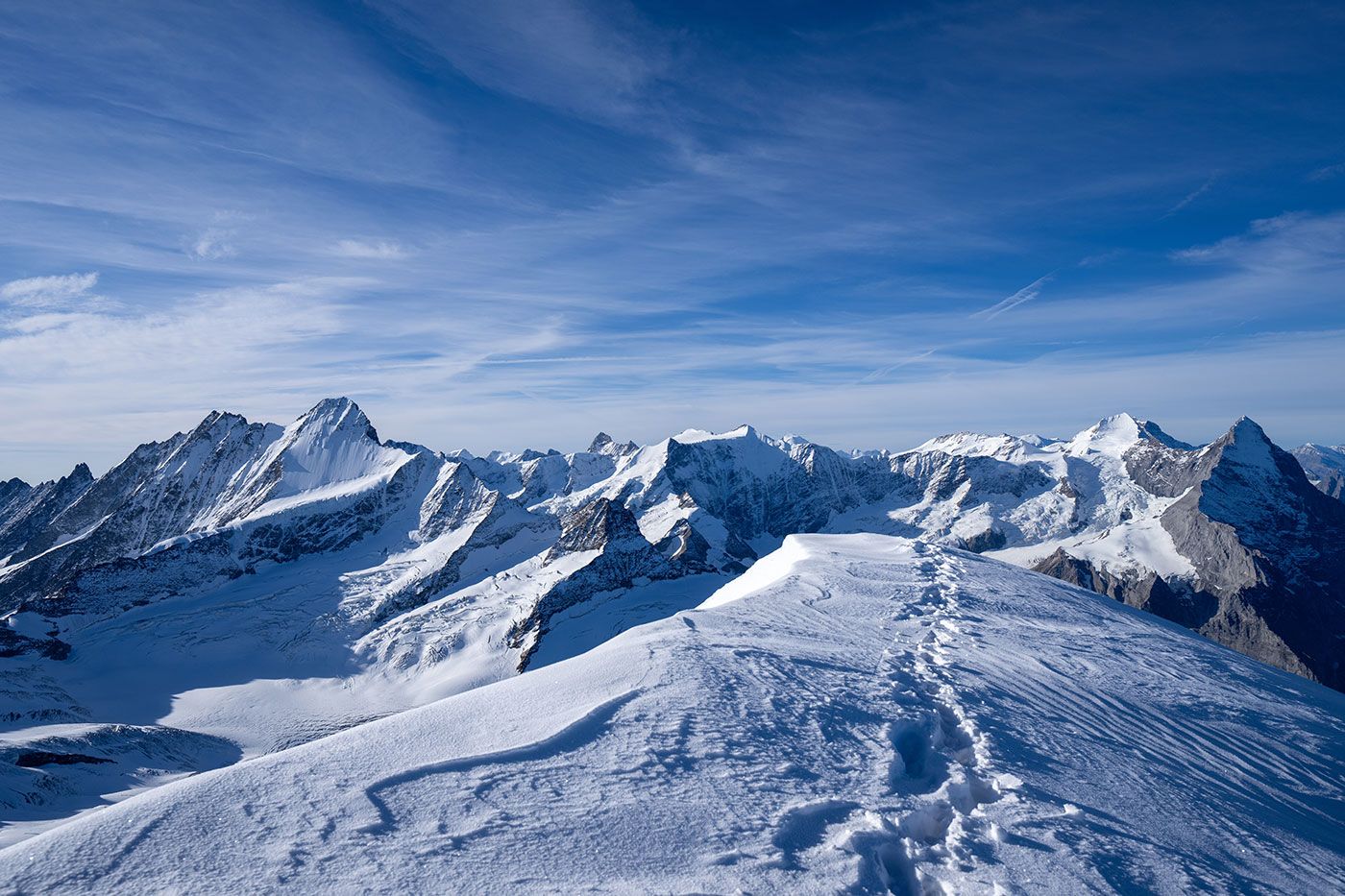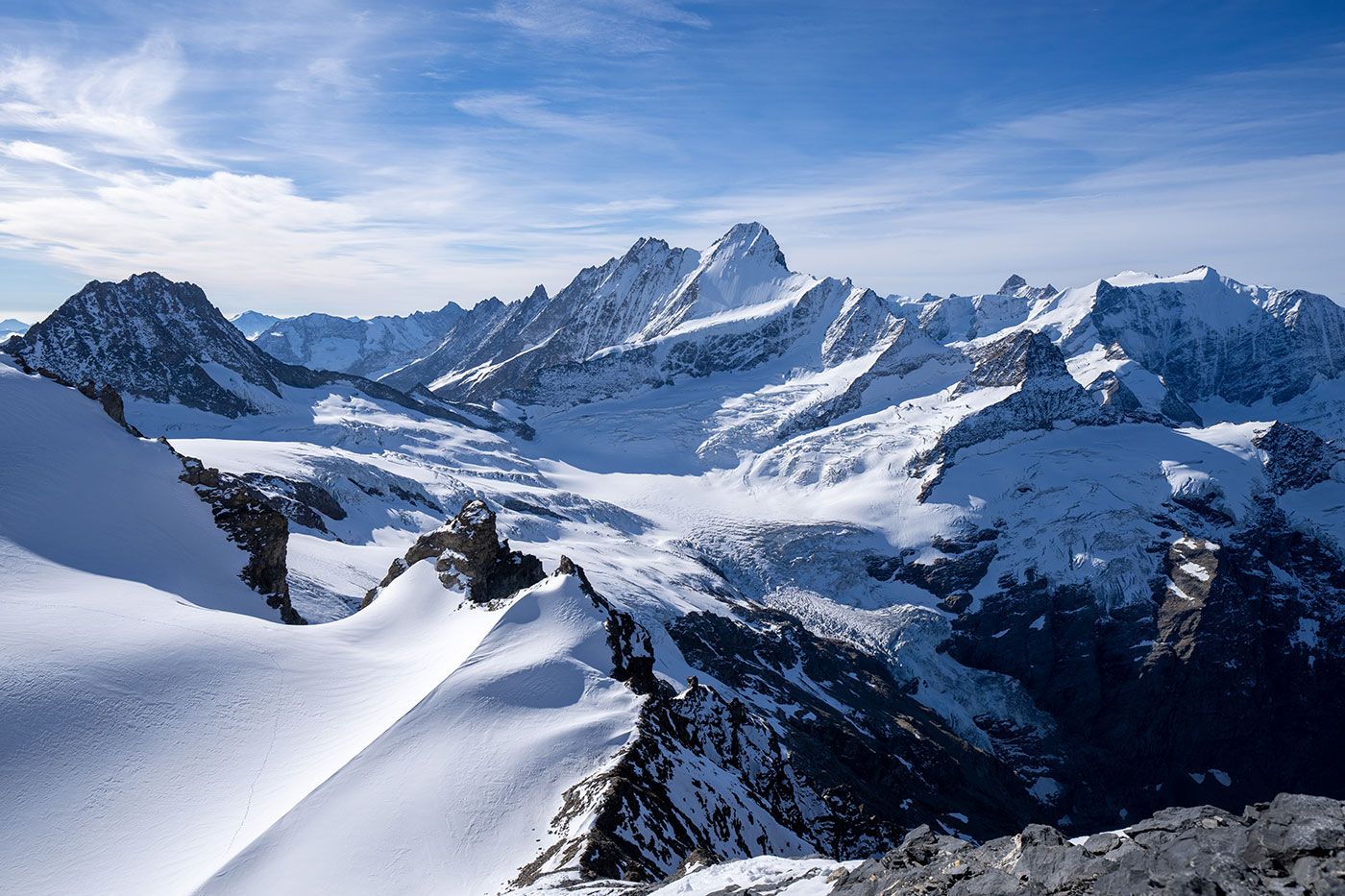 Von der Hütte lässt sich der Gipfelhang nicht einsehen und auch nicht der Schneegipfel des Wetterhorns. Jetzt endlich wissen wir, wovon uns die Bergsteiger jeweils mit leuchtenden Augen berichten. Nach etwas mehr als vier Stunden stehen wir also überglücklich zum ersten Mal auf Grindelwald's Hausberg. 3692 Meter über Meer, umgeben von den mächtigsten Gipfeln der Berneralpen und ein grandioser Weitblick bis zum Säntis und zum Chasseral.