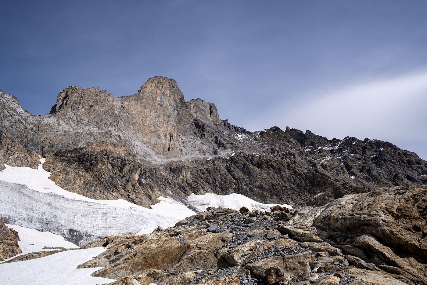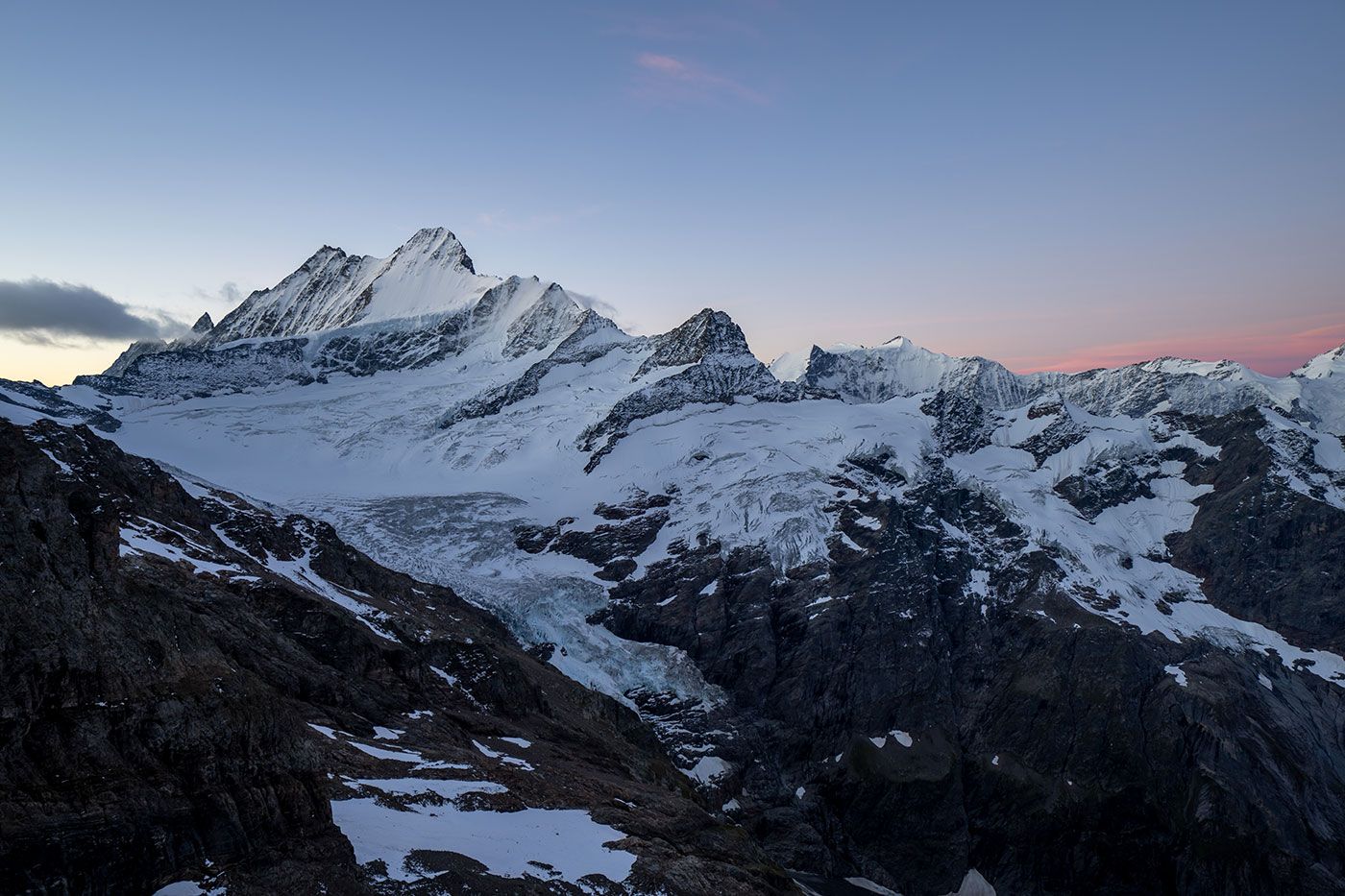 Erst nach fünf Uhr morgens leuchten wir uns den Weg durch die mondlose Nacht bergwärts. Gerade so, dass wir an diesem Spätseptembertag oben am Chrinnengletscher die Stirnlampen löschen können. Von dort geht's über den weitgehend aperen Gletscher dem Willsgrätli entgegen.