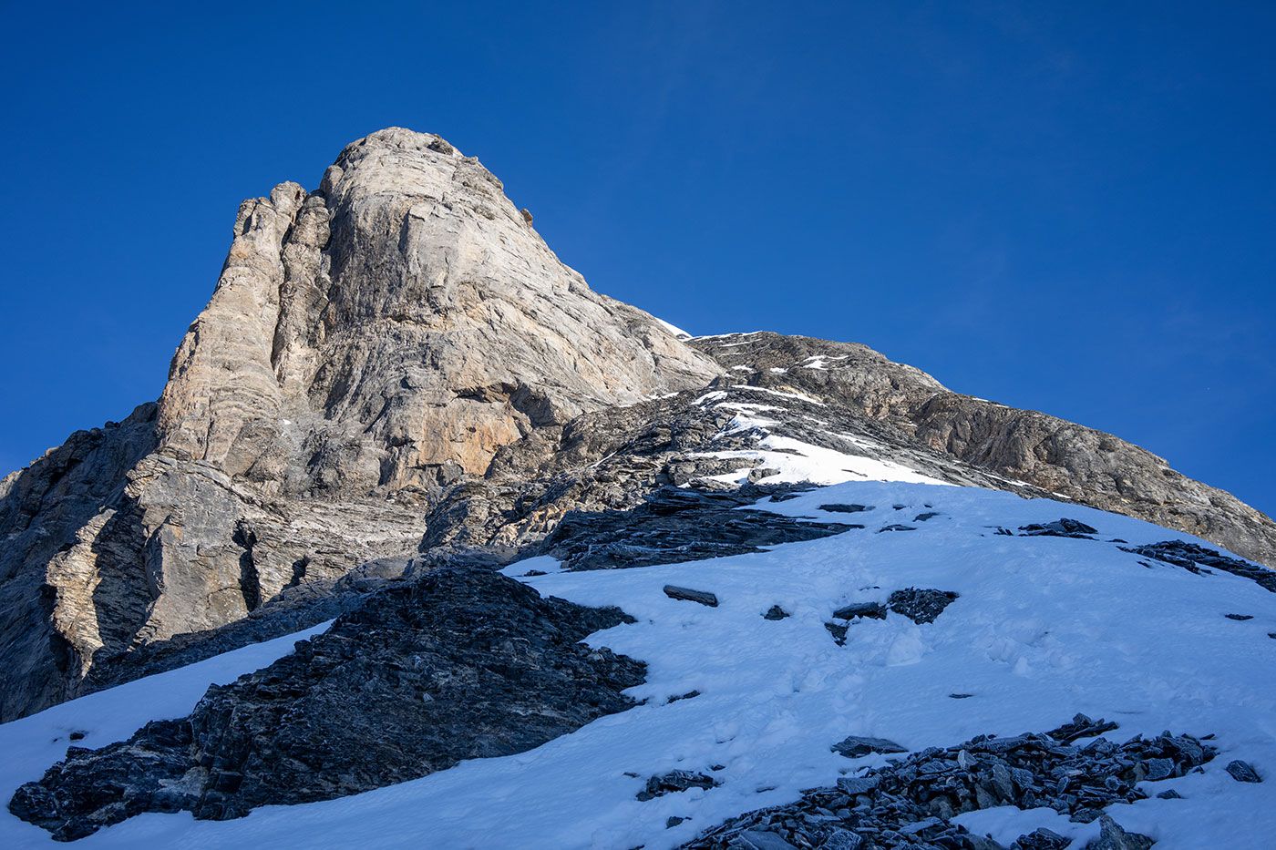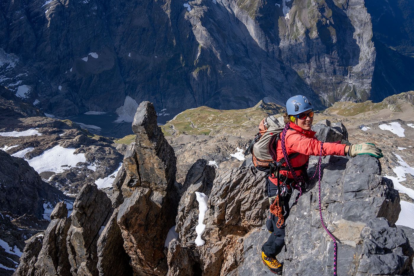 Was aus der Hüttenperspektive fast senkrecht wirkt, bleibt auch am Berg noch zünftig stotzig. Ein wilder Zustieg und dann ein paar luftige Kletterzüge über das meist felsenfeste Grätli bis hinauf zur Wetterlücke. Kaum vorstellbar, dass eines unserer kleinen Kätzli auch schon bis hierher gelangte.