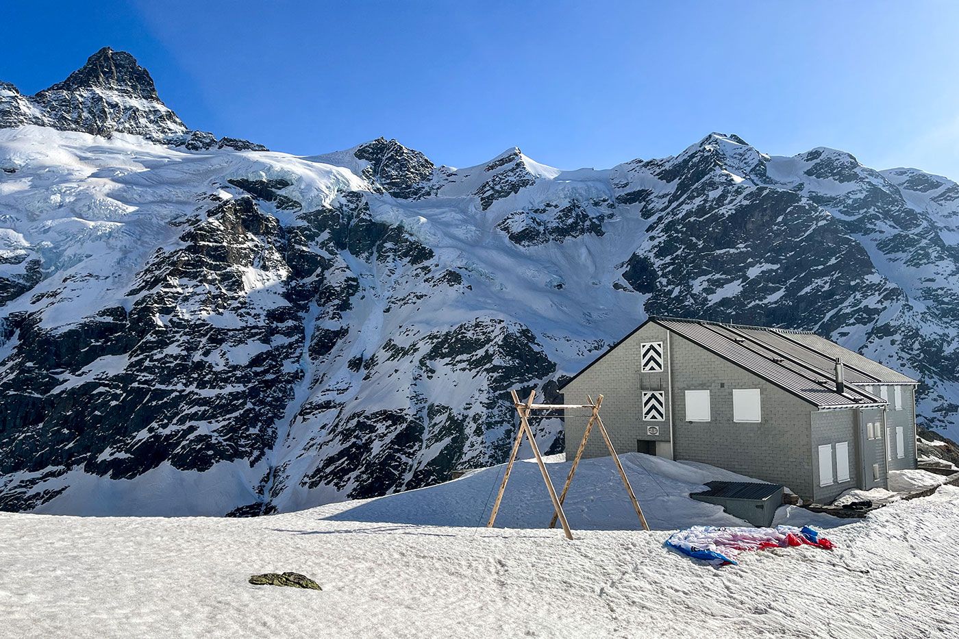 Leider ist es schon etwas spät und so verzichte ich darauf, die Hüttentüre auszugraben. Von aussen macht die Hütte einen unversehrten Eindruck und so warte ich nicht lange mit dem Start zum Heimflug. An den sonnigen Flanken des Wetterhorns geht es nochmals hoch bis über 3000 Meter und ein Stück weit zeigt mir sogar der Bartgeier, wo das Zentrum der Thermik liegt.