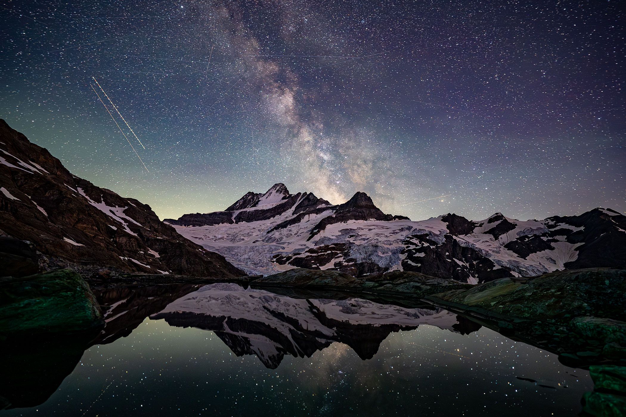 Wenn der Ort magisch, der Himmel klar, der Mond leer und der Wind still ist, dann ist die Hälfte der Bedingungen erfüllt, die es braucht für solche Bilder! In einer der Sternschnuppennächte dieses Sommers war das der Fall und so habe ich meine Fotoausrüstung vor Sonnenuntergang zum Augenseelein gebracht und installiert für die hoffentlich perfekten Aufnahmen.